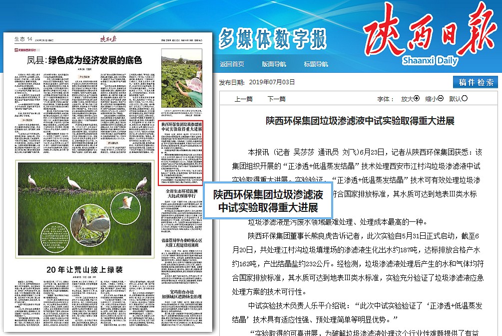 陜西日報:陜西環(huán)保集團(tuán)垃圾滲濾液中試實(shí)驗取得重大進(jìn)展